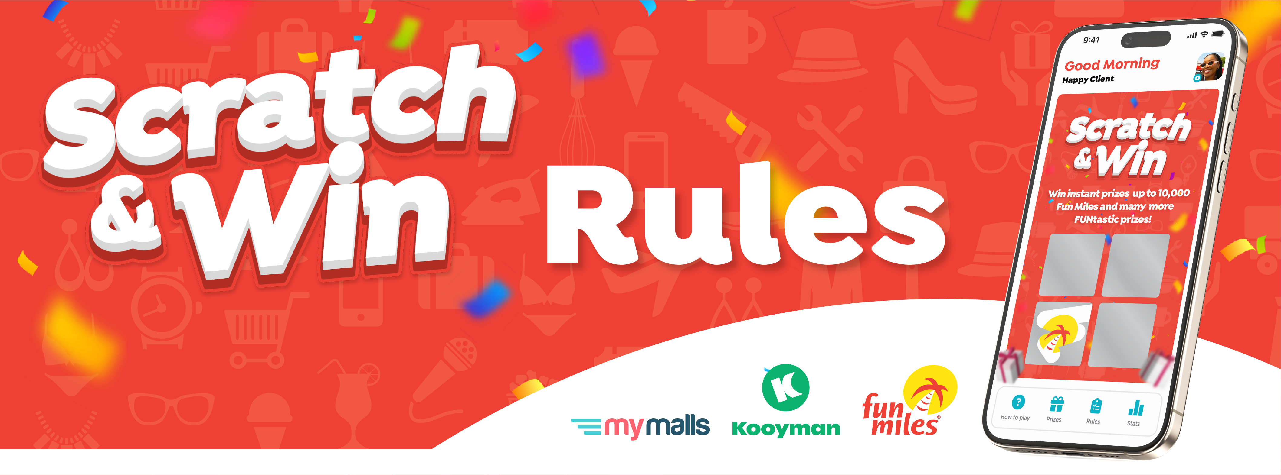 By participating in the campaign, participants agree to comply with these Terms and Conditions. Fun Miles, Kooyman, and MyMalls reserve the right to modify, suspend, or end the campaign at any time without prior notice. Fun Miles, Kooyman, and MyMalls are not responsible for any technical malfunctions, lost or incomplete entries, or other factors that may impact participation in the Scratch & Win game.