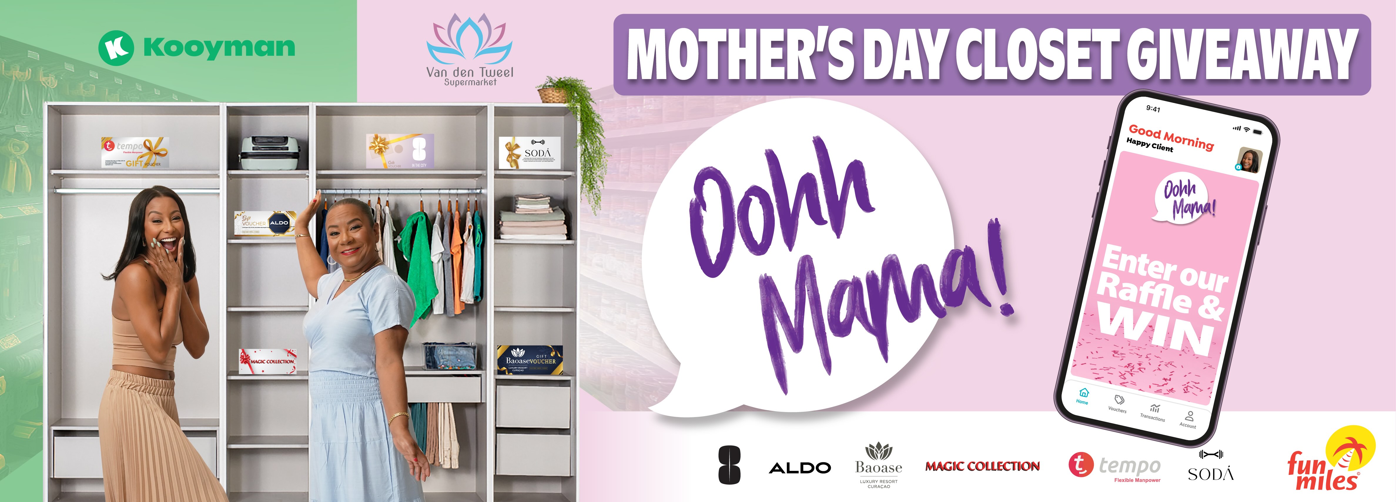 By participating in the campaign, participants agree to comply with these rules and regulations. Fun Miles, Kooyman and Van Den Tweel reserve the right to modify, suspend, or end the campaign at any time without prior notice. Fun Miles, Kooyman and Van Den Tweel are not responsible for any technical malfunctions, lost or incomplete entries, or other factors that may impact participation in the Oohh Mama! Campaign 2025.